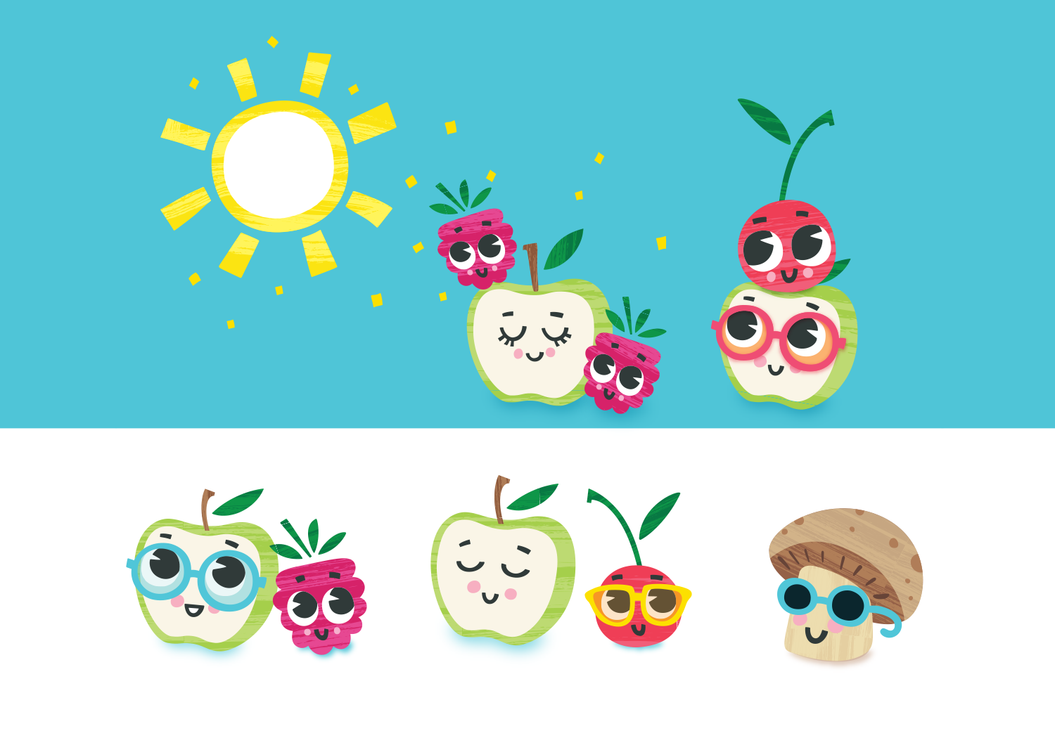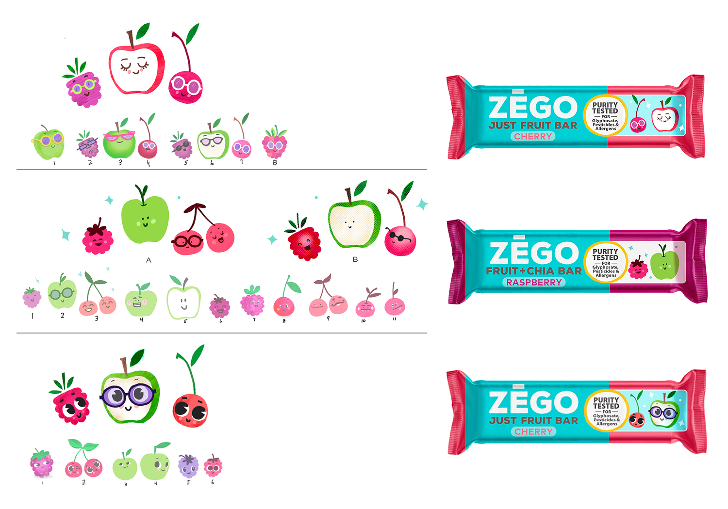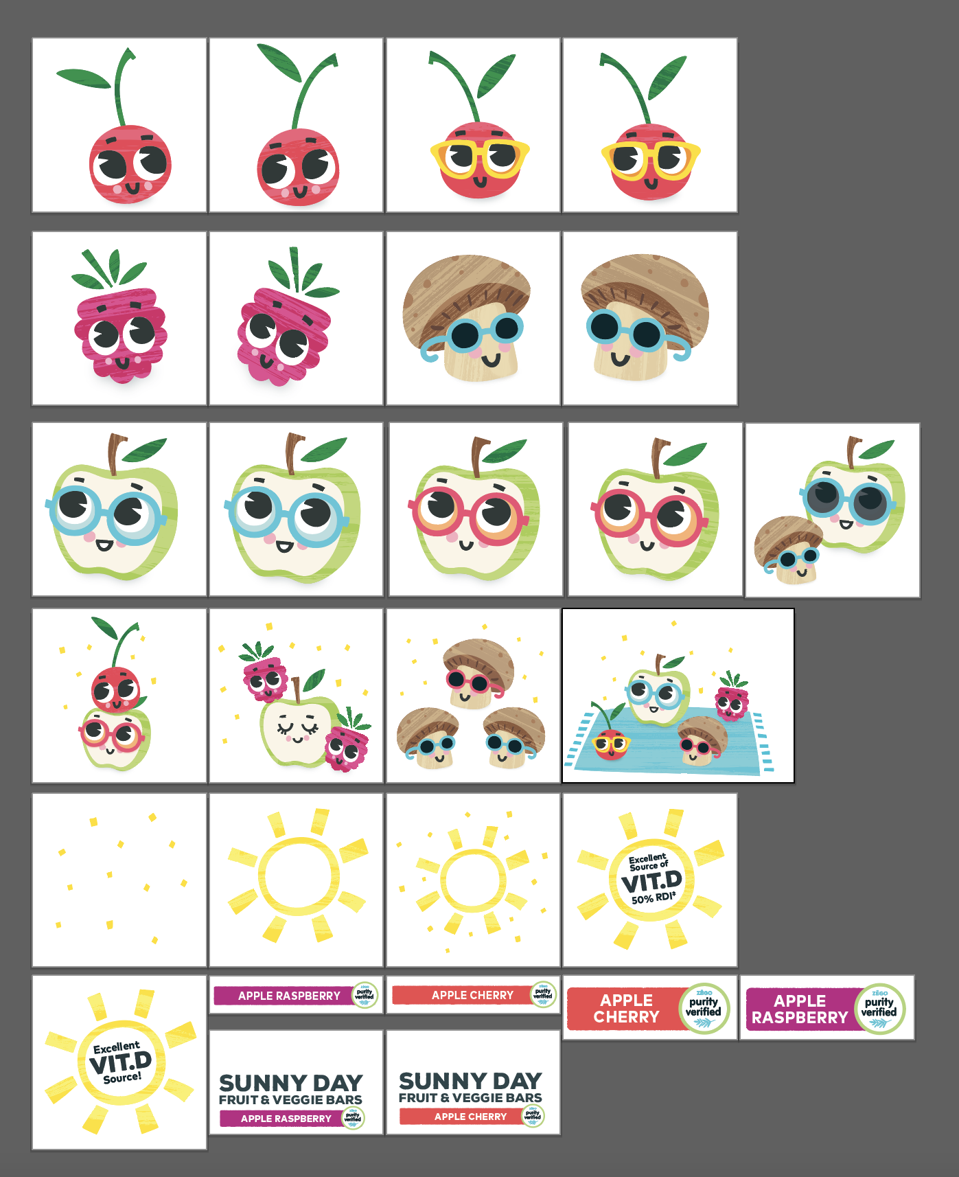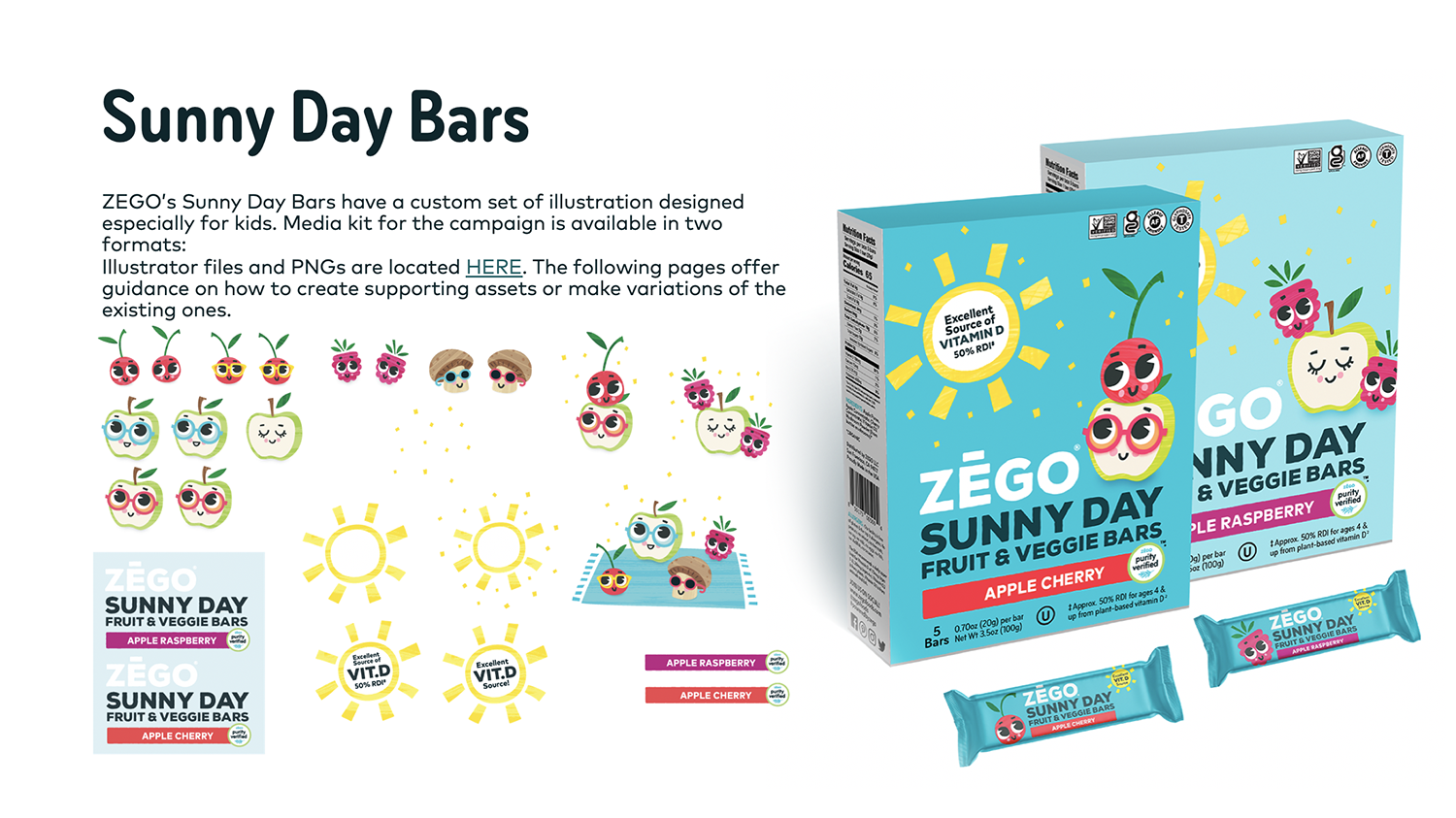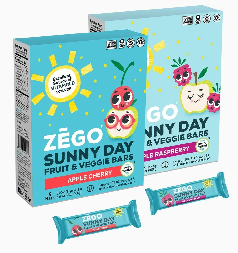 For Zego Foods’ Sunny Day Bars, we aimed for a fun, approachable look that would appeal to kids and parents. The goal: highlight the extra vitamin D with friendly fruit characters. I collaborated with designer Lauren Hart on the illustrations, then developed a style guide section and a media kit featuring the artwork. The bars went on to become a finalist for a NEXTY award at Natural Product Expo West!