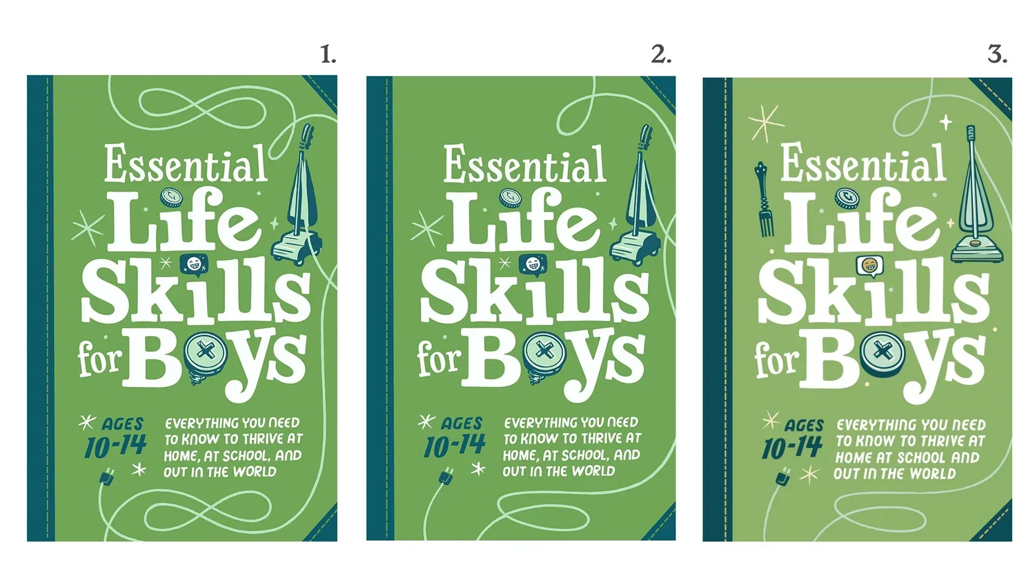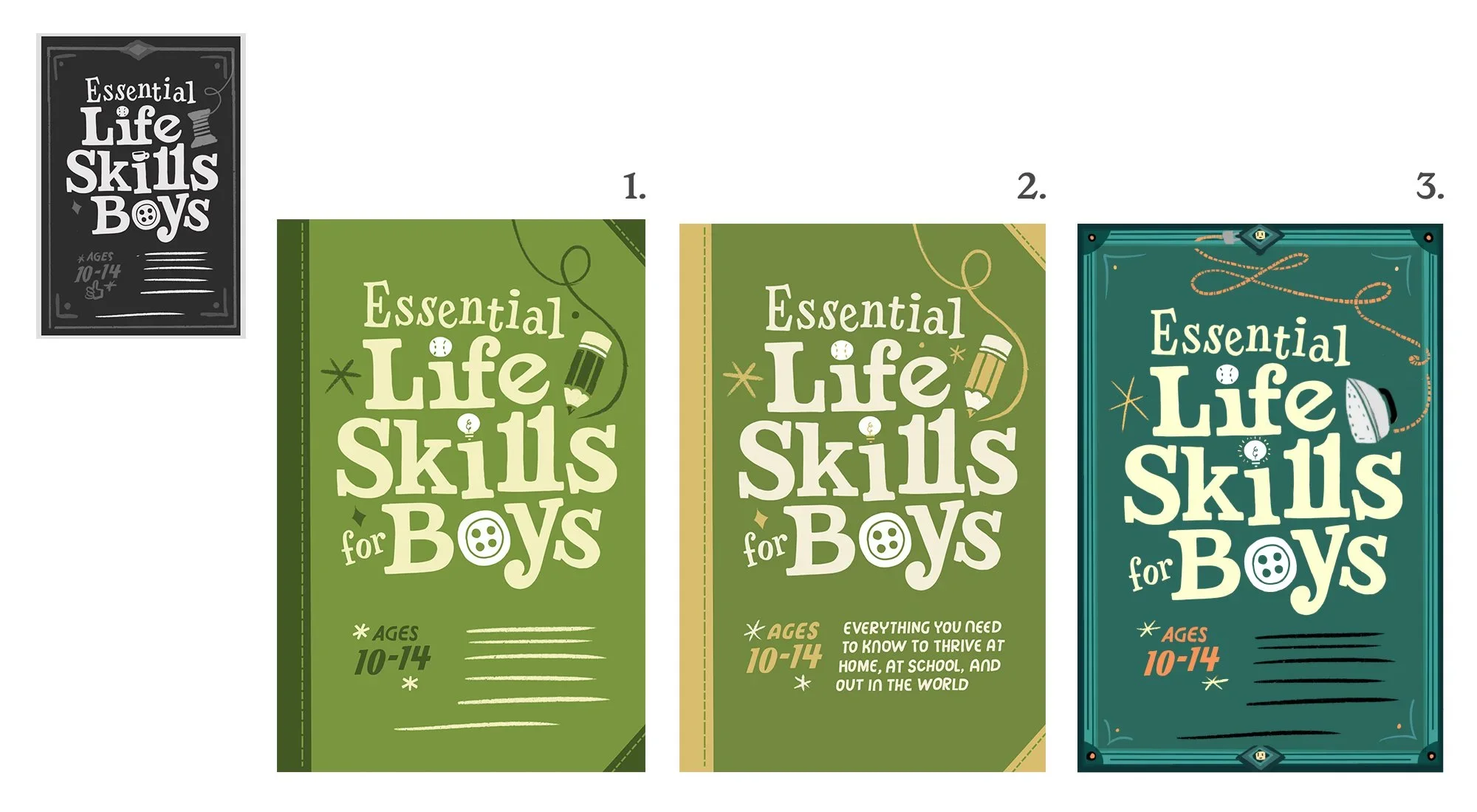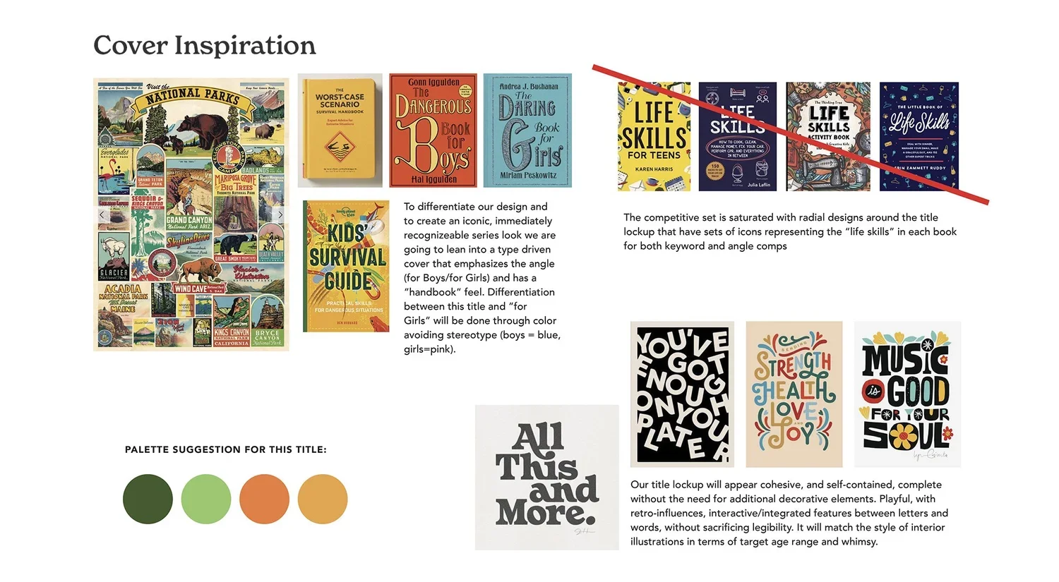 Phase 1- Mood Boards & Brief: The brief set the tone with a clear style and palette, encouraging a type-driven, hand-lettered look inspired by vintage handbooks and park posters. It also needed to stand out within its category and leave room for a companion title, Essential Life Skills for Girls.